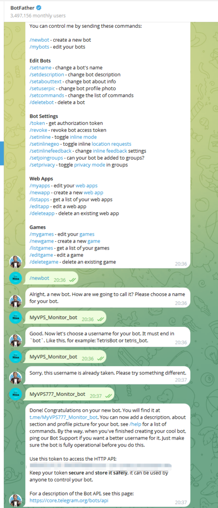 MyMonitor) and give it a username (must end inbot, e.g.,MyMonitor_bot). - Once successful, you will receive an HTTP API Token (it looks like