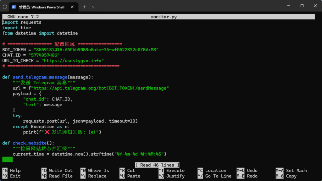 Create a new file named monitor.py on your VPS and paste the following code. Remember to replace the Token and ID at the top!